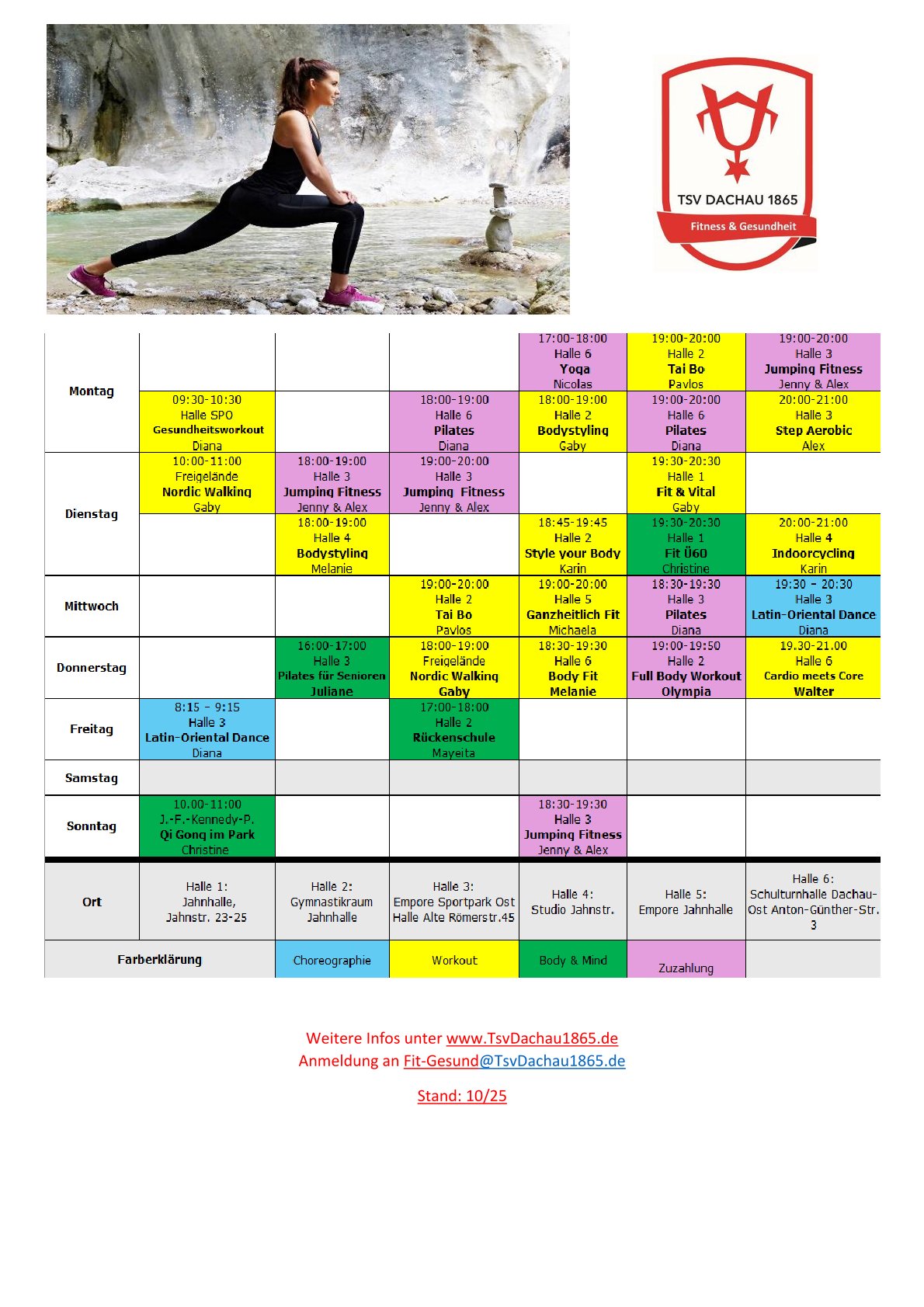 Gesundheitsworkout - Dieses Workout richtet sich hauptsächlich an unsere Senioren. Unverzichtbar, um möglichst lange fit und gelenkig zu bleiben und Stürzen vorzubeugen. Indoorcycling - intensives Ausdauertraining auf unseren Indoor-Rädern (Anmeldung unter Diese E-Mail-Adresse ist vor Spambots geschützt! Zur Anzeige muss JavaScript eingeschaltet sein. erforderlich)