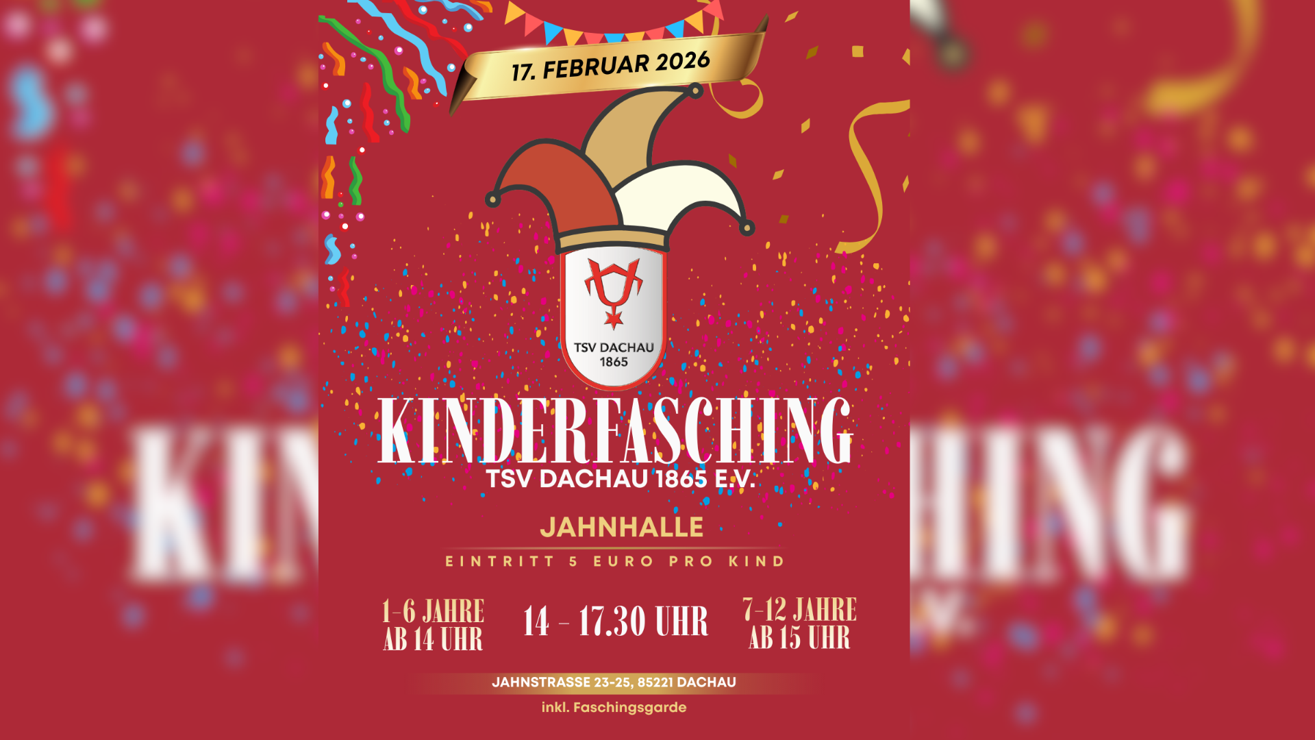 Am 17. Februar 2026 wird es wieder richtig bunt und lustig, denn der TSV Dachau 1865 e.V. lädt alle Kinder bis 12 Jahre zur alljährlichen fröhlichen Faschingsparty in der Jahnhalle ein. Von 14.00 bis 17.30 Uhr wird getanzt, gespielt und gelacht, was das Zeug hält. Ab 14 Uhr dürfen alle Kinder von 1 bis 6 Jahren mitfeiern, ab 15 Uhr sind auch die 7- bis 12-Jährigen herzlich willkommen sich in einem großen Bewegungsparkour auszutoben.